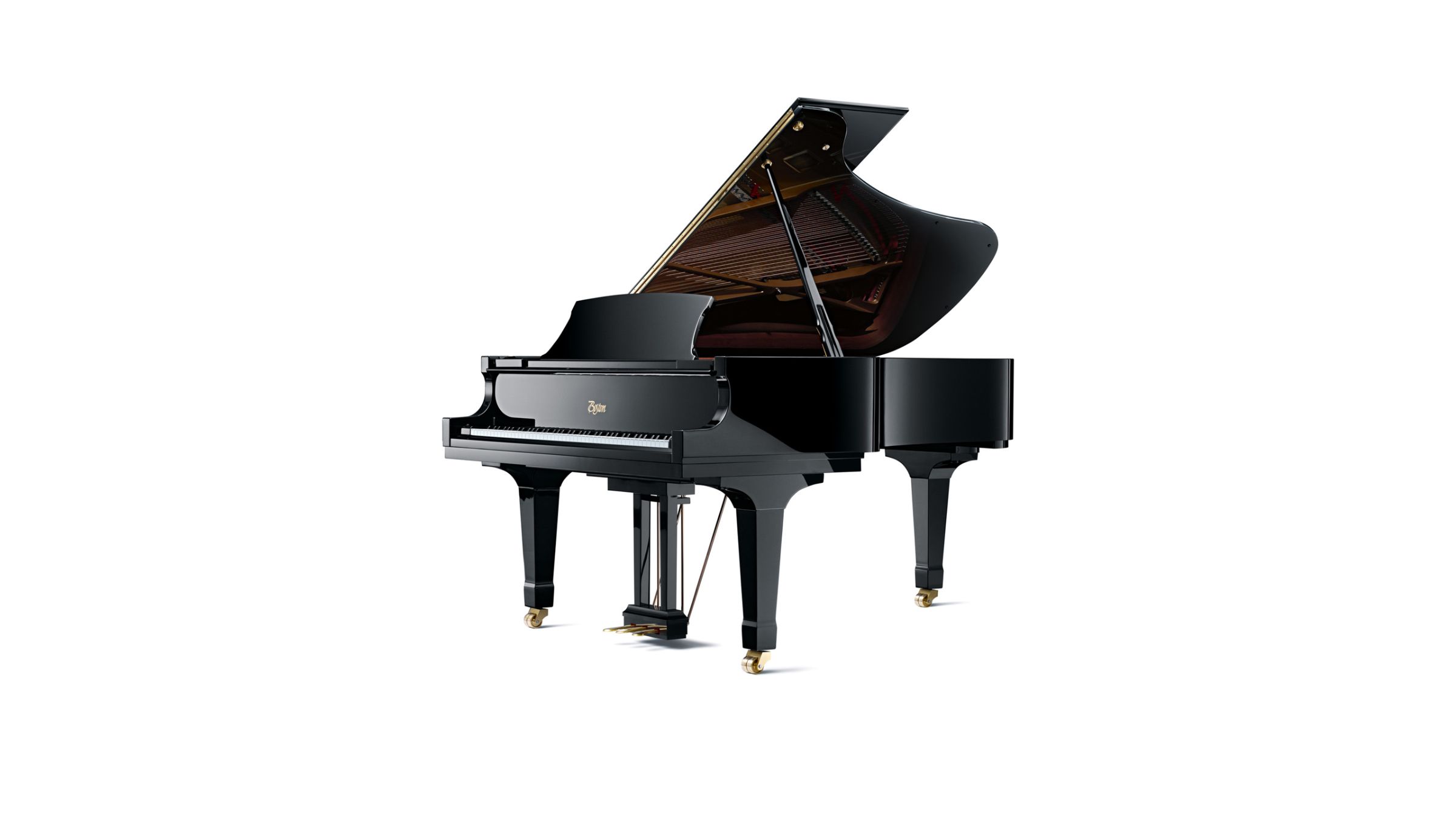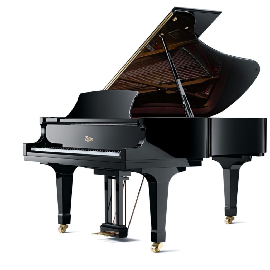 The Boston grand piano offers a larger soundboard in comparison to other pianos of the same length, due to its innovative “wide tail” design. This wider construction of the case means that a 5′ 10″ Boston grand has the same soundboard area as a typical 6′ 2″ grand piano, creating the power, richness, and feel of playing a much larger piano.