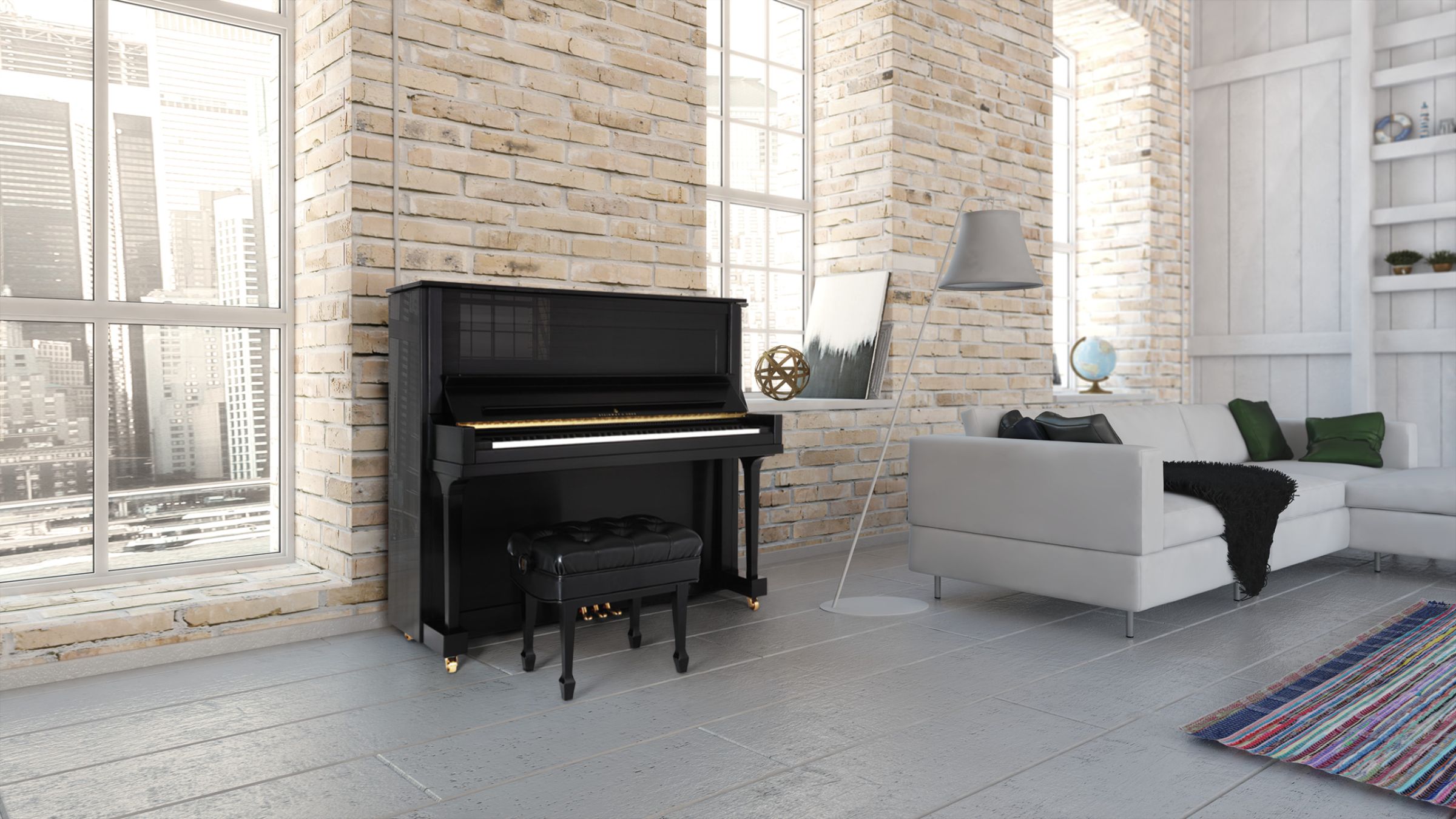 Overstrung; twenty-six note bass/tenor break. Treble duplex. Tension: 37,500 lbs. (16,875 kg)