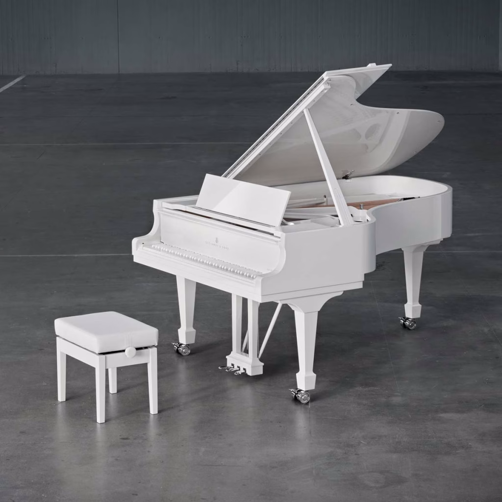 The Ultra White edition offers a striking contrast. Its rim is finished in Pure White, a luminous, soft white often used in interiors for its clarity and brightness. The washed underside and white-stained soundboard keep the design light and cohesive, while the high-gloss white cast-iron plate at the piano’s core adds a sculptural element. Chrome metal fittings and studio double casters (without rubber) provide crisp accents, balancing the purity of the design. Like its counterpart, the Ultra White carries only a discreet engraved logo on the front. Its all-white keyboard gives the instrument a distinct character — simple, minimal, and full of presence.